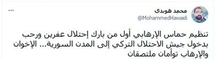 جاء ذلك في تغريدة عبر "تويتر"، اليوم، قائلا: "تنظيم حماس الإرهابي أول من بارك احتلال عفرين ورحب بدخول جيش الاحتلال التركي إلى المدن السورية.. الإخوان والإرهاب توأمان ملتصقان".