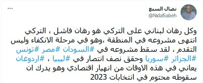 اعتبر المحلل السياسي السوري نضال السبع، أن أي رهان لبناني على تركيا هو رهان فاشل، تزامنا مع سقوط المشروع التركي في المنطقة والانهيار الاقتصاد الذي تعيشه أنقرة.