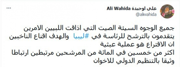 وبيّن في تغريدة عبر "تويتر"، اليوم: "جميع الوجوه السيئة الصيت التي أذاقت اللبيين الأمرين يتقدمون بالترشح للرئاسة في ليبيا"، مشيرا إلى أن الهدف: "إقناع الناخبين أن الاقتراع هو عملية عبثية".