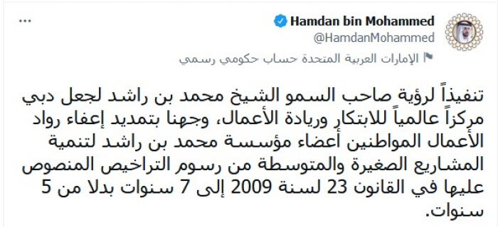 أوضح ذلك في تغريدة عبر "تويتر"، اليوم: "تنفيذا لرؤية صاحب السمو الشيخ محمد بن راشد، لجعل دبي مركزا عالميا للابتكار وريادة الأعمال، وجهنا بتمديد إعفاء رواد الأعمال المواطنين أعضاء مؤسسة محمد بن راشد لتنمية المشاريع الصغيرة والمتوسطة من رسوم التراخيص المنصوص عليها في القانون 23 لسنة 2009 إلى 7 سنوات بدلا من 5 سنوات"