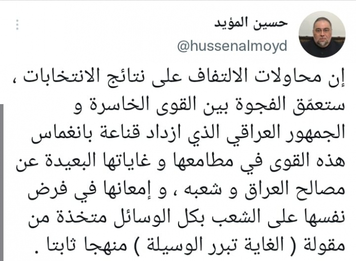 وشدد في تغريدة على حسابه بموقع التدوين المصغر تويتر، اليوم على أن: "محاولات الالتفاف على نتائج الانتخابات ستعمّق الفجوة بين القوى الخاسرة والجمهور العراقي".