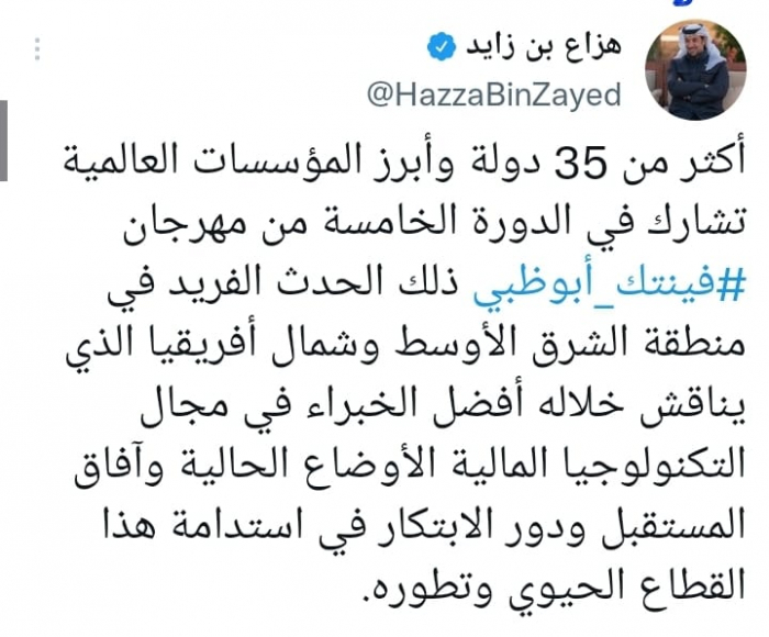 وأشار في تغريدة على حسابه بموقع التدوين المصغر تويتر، اليوم إلى أن: "أكثر من 35 دولة وأبرز المؤسسات العالمية تشارك في الدورة الخامسة من مهرجان فينتك أبوظبي".
