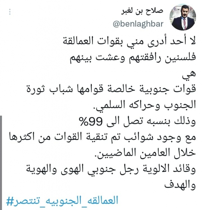 وقال في تغريدة على حسابه بموقع التدوين المصغر تويتر، اليوم إن: "لا أحد أدرى مني بقوات العمالقة فلسنين رافقتهم وعشت بينهم هي قوات جنوبية خالصة قوامها شباب ثورة الجنوب وحراكه السلمي".