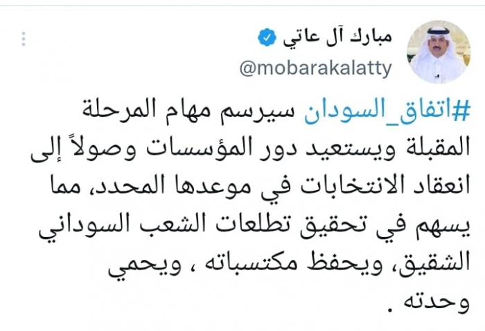 وأكد في تغريدة على حسابه بموقع التدوين المصغر تويتر، اليوم أن: "اتفاق السودان سيرسم مهام المرحلة المقبلة ويستعيد دور المؤسسات وصولاً إلى انعقاد الانتخابات في موعدها المحدد".