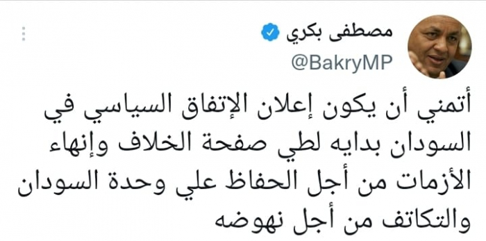 وقال في تغريدة على حسابه بموقع التدوين المصغر تويتر، اليوم إني: "أتمني أن يكون إعلان الاتفاق السياسي في السودان بداية لطي صفحة الخلاف وإنهاء الأزمات من أجل الحفاظ علي وحدة السودان والتكاتف من أجل نهوضه".