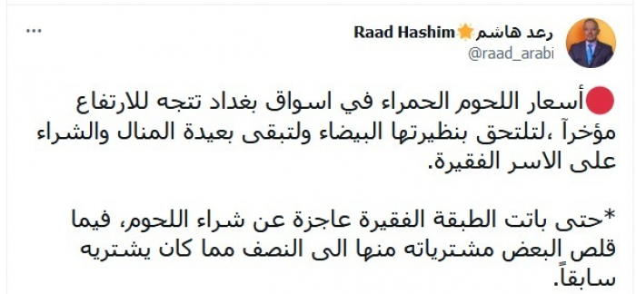 استنكر المحلل السياسي العراقي رعد هاشم، ارتفاع أسعار اللحوم الحمراء والبيضاء في العراق، حتى أصبحت بعيدة الشراء عن الأسر الفقيرة.
