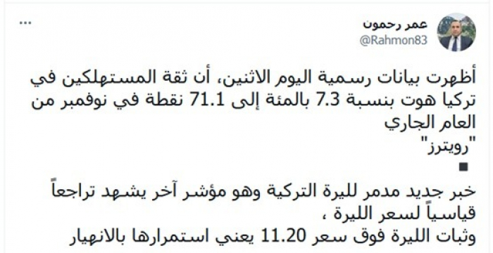 ووصف هذا الخبر، بـ"مدمر لليرة التركية.. وهو مؤشر آخر يشهد تراجعا قياسيا لسعر الليرة"،مستكملا: "ثبات الليرة فوق سعر 11.20 يعني استمرارها بالانهيار".