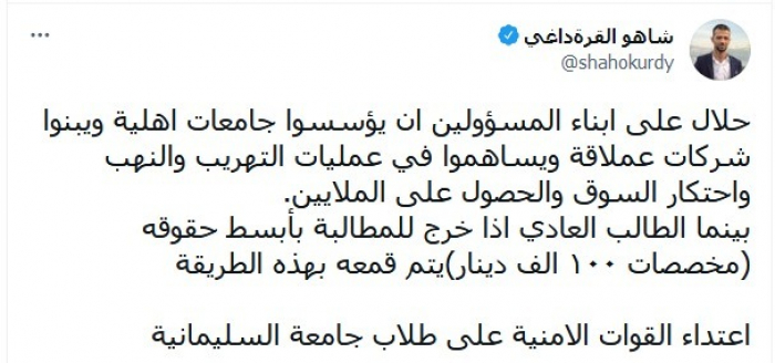 ندد الكاتب الصحفي العراقي شاهو القرة داغي، باعتداء الأمن العراقي، على طالبات جامعة السليمانية، أثناء احتجاجهن للمطالبة بصرف وتحسين المنح.
