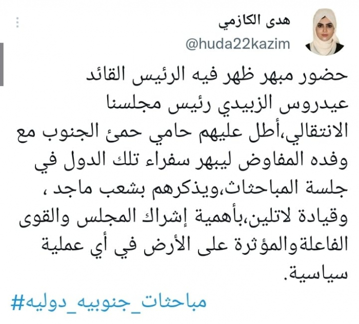 وأشارت في تغريدة على حسابها بموقع التدوين المصغر تويتر، اليوم إلى: "حضور مبهر ظهر فيه الرئيس القائد عيدروس الزُبيدي رئيس مجلسنا الانتقالي".