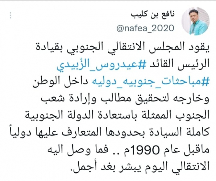 وكشف في تغريدة على حسابه بموقع التدوين المصغر تويتر، اليوم أنه: "يقود المجلس الانتقالي الجنوبي بقيادة الرئيس القائد عيدروس الزُبيدي مباحثات جنوبية دولية داخل الوطن وخارجه".
