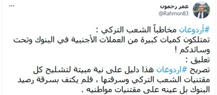 حذر المحلل السياسي السوري عمر رحمون، الشعب التركي من نية أردوغان المبيتة لسرقة مقتنياتهم، بعدما خاطبهم مؤخرا بشأن امتلاكهم كميات كبيرة من العملات الأجنبية تحت الوسائد، تزامنا مع انهيار الليرة التركية.