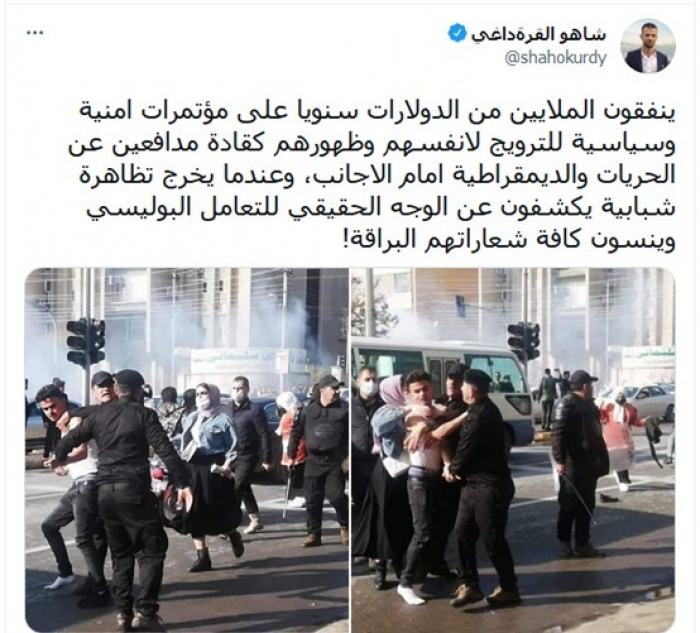 أدان الكاتب الصحفي العراقي شاهو القرة داغي، التعامل الوحشي للأمن العراقي بحق طلاب جامعة السليمانية المحتجين للمطالبة بصرف المنح والمخصصات البالغة 100 ألف دينار.