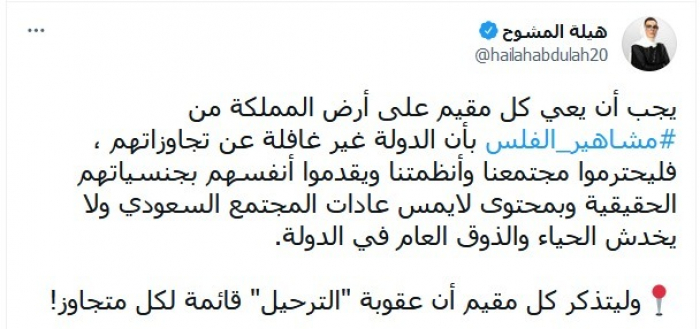 وأوضحت في تغريدة عبر "تويتر"، اليوم: "يجب أن يعي كل مقيم على أرض المملكة من مشاهير الفلس بأن الدولة غير غافلة عن تجاوزاتهم".