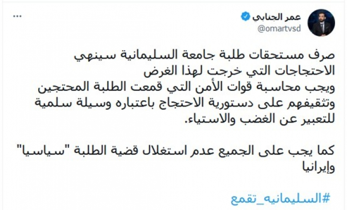 وناشد الجميع: "عدم استغلال قضية الطلبة سياسيا وإيرانيا"، مختتما تغريدته بهاشتاج: "السليمانية تقمع".