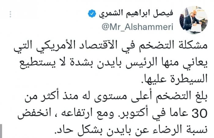 وأوضح في تغريدة على حسابه بموقع التدوين المصغر تويتر، اليوم أن: "مشكلة التضخم في الاقتصاد الأمريكي التي يعاني منها الرئيس بايدن بشدة لا يستطيع السيطرة عليها".