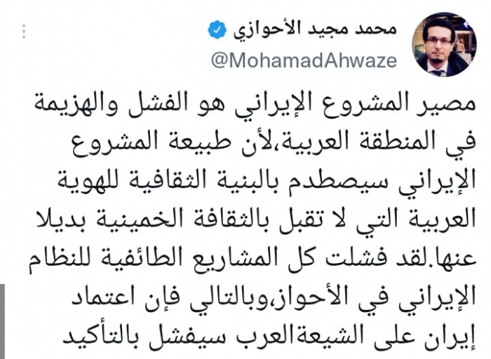 وأردف: "التي لا تقبل بالثقافة الخمينية بديلا عنها، لقد فشلت كل المشاريع الطائفية للنظام الإيراني في الأحواز، وبالتالي فإن اعتماد إيران على الشيعة العرب سيفشل بالتأكيد".