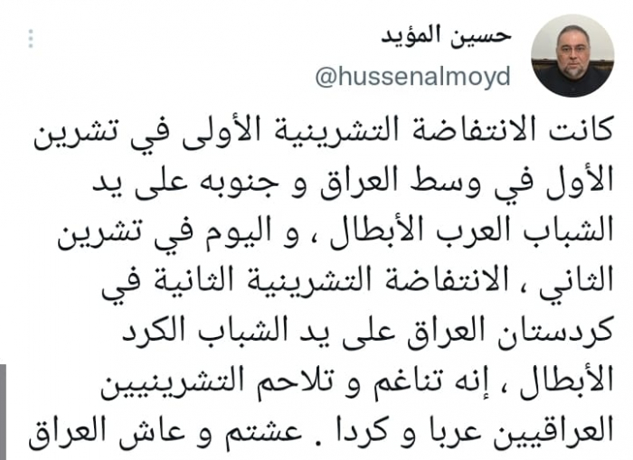 اعتبر الناشط السياسي حسين المؤيد أن التظاهرات الشعبية في كردستان العراق، انتفاضة تشرينية ثانية، في إشارة إلى حراك تشرين للشباب العراقيين العرب قبل عامين ضد مليشيات إيران.