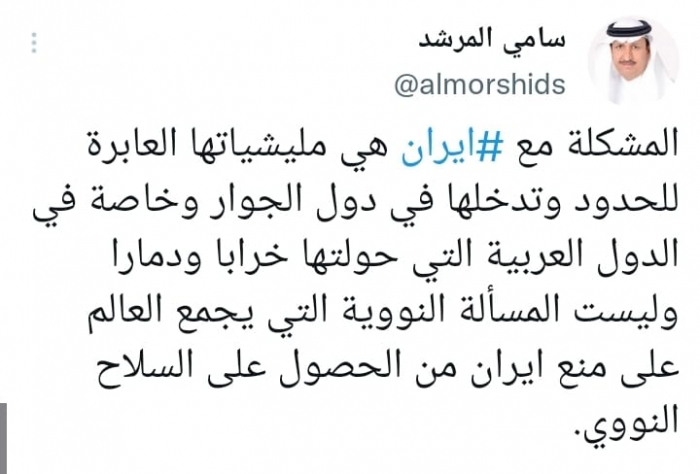 ورأى في تغريدة على حسابه بموقع التدوين المصغر تويتر، اليوم أن: "المشكلة مع إيران هي مليشياتها العابرة للحدود وتدخلها في دول الجوار وخاصة في الدول العربية التي حولتها خرابا ودمارا".