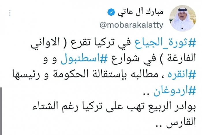 وكتب في تغريدة على حسابه بموقع التدوين المصغر تويتر، اليوم أن: "ثورة جياع في تركيا تقرع (الأواني الفارغة) في شوارع أسطنبول وأنقرة، مطالبة باستقالة الحكومة و رئيسها أردوغان".