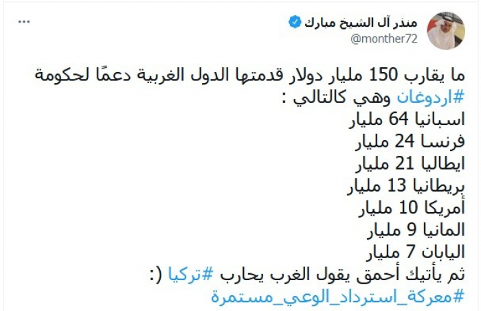 وكتب في تغريدة عبر "تويتر"، اليوم: "ما يقارب 150 مليار دولار قدمتها الدول الغربية دعما لحكومة أردوغان وهي كالتالي: