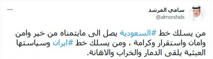شدد المحلل السياسي السعودي سامي المرشد، على أن من ينتهج سياسة المملكة العربية السعودية، سيصل إلى الأمن والأمان والاستقرار، على عكس سياسة النظام الإيراني التي تجلب الدمار والخراب.