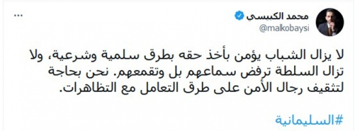واستكمل في تغريدة عبر "تويتر"، اليوم: "نحن بحاجة لتثقيف رجال الأمن على طرق التعامل مع التظاهرات"، مختتما تغريدته بهاشتاج: "السليمانية".
