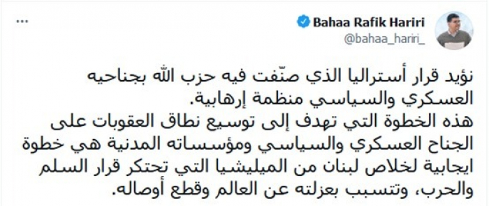رحب رجل الأعمال اللبناني بهاء الحريري، نجل رئيس وزراء لبنان الأسبق رفيق الحريري، بقرار الحكومة الأسترالية، تصنيف مليشيا حزب الله، منظمة إرهابية.