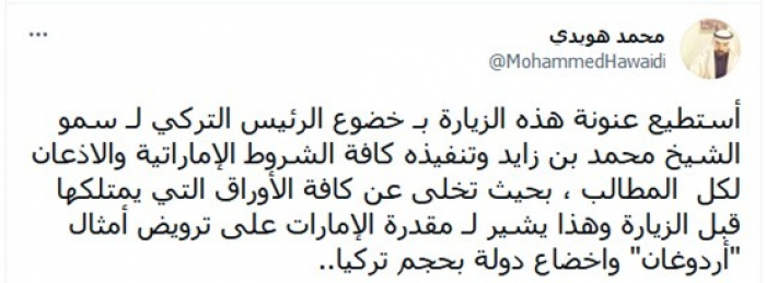 وحدد عنوانا لهذه الزيارة: "أستطيع عنونة هذه الزيارة بـ خضوع الرئيس التركي لـ سمو الشيخ محمد بن زايد، وتنفيذه كافة الشروط الإماراتية والإذعان لكل المطالب".
