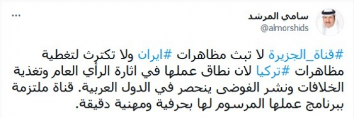 ولفت إلى أن: "قناة الجزيرة لا تبث مظاهرات إيران ولا تكترث لتغطية مظاهرات تركيا، لأن نطاق عملها في إثارة الرأي العام وتغذية الخلافات ونشر الفوضى ينحصر في الدول العربية".