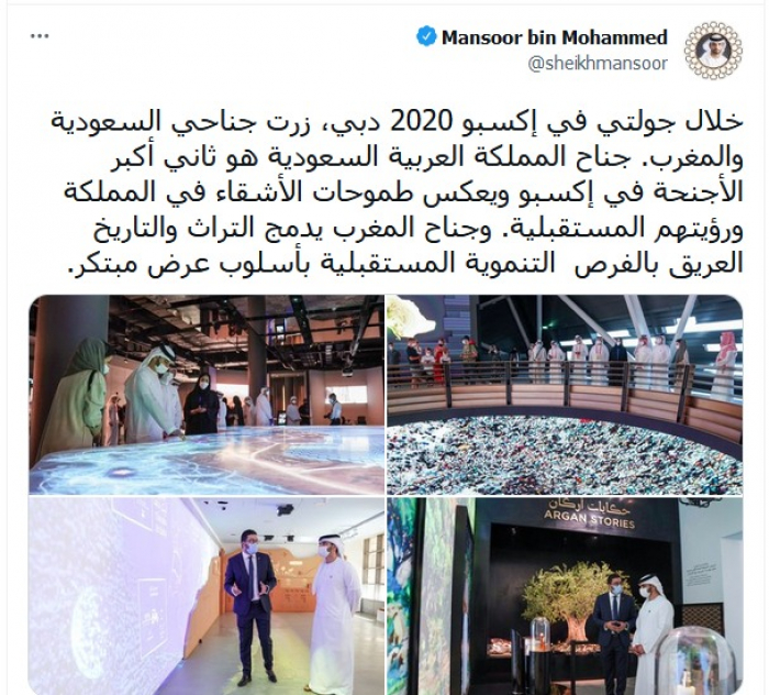 تفقد الشيخ منصور بن محمد بن راشد آل مكتوم، رئيس مجلس دبي الرياضي، جناحي المملكة العربية السعودية، والمغرب، في معرض إكسبو 2020 بدبي.