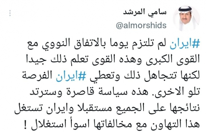 وأوضح في تغريدة على حسابه بموقع التدوين المصغر تويتر، اليوم أن: "إيران لم تلتزم يوما بالاتفاق النووي مع القوى الكبرى وهذه القوى تعلم ذلك جيدا لكنها تتجاهل ذلك وتعطي إيران الفرصة تلو الأخرى".