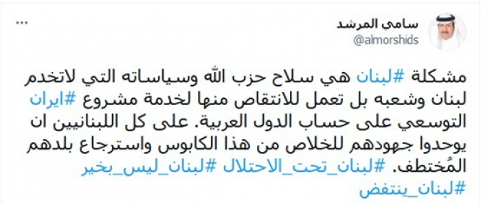 وأشار إلى أن: "مشكلة لبنان هي سلاح حزب الله وسياساته التي لا تخدم لبنان وشعبه بل تعمل للانتقاص منها لخدمة مشروع إيران التوسعي على حساب الدول العربية".