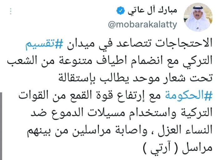 كشف الكاتب الصحفي مبارك آل عاتي عن قمع الشرطة التركية للمتظاهرين المطالبين برحيل الرئيس رجب طيب أردوغان، لسياساته الفاشلة اقتصاديا وسياسيا.