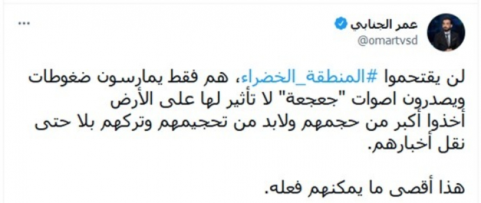 وشدد في تغريدة عبر "تويتر"، على أنهم: "لن يقتحموا المنطقة الخضراء، هم فقط يمارسون ضغوطات ويصدرون أصوات جعجعة لا تأثير لها على الأرض".