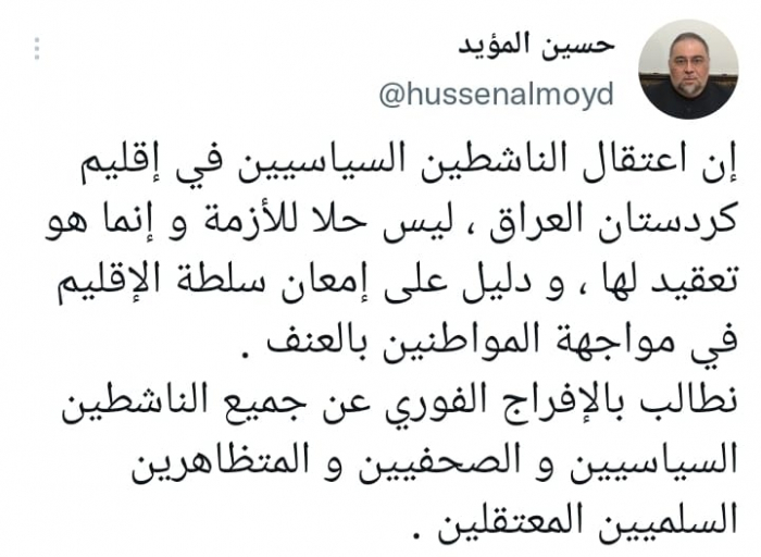 واعتبر في تغريدة على حسابه بموقع التدوين المصغر تويتر، اليوم أن: "اعتقال الناشطين السياسيين في إقليم كردستان العراق، ليس حلا للأزمة وإنما هو تعقيد لها ودليل على إمعان سلطة الإقليم في مواجهة المواطنين بالعنف".