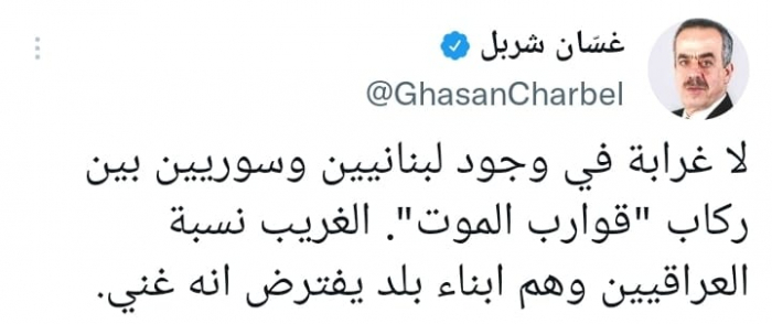 وأوضح في تغريدة على حسابه بموقع التدوين المصغر تويتر، اليوم أنه: "لا غرابة في وجود لبنانيين وسوريين بين ركاب قوارب الموت، مضيفا: "الغريب نسبة العراقيين وهم أبناء بلد يفترض أنه غني".