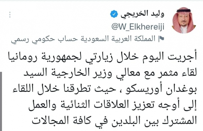 وكشف في تغريدة على حسابه بموقع التدوين المصغر تويتر، اليوم أني: "أجريت اليوم خلال زيارتي لجمهورية رومانيا لقاء مثمر مع معالي وزير الخارجية السيد بوغدان أوريسكو".