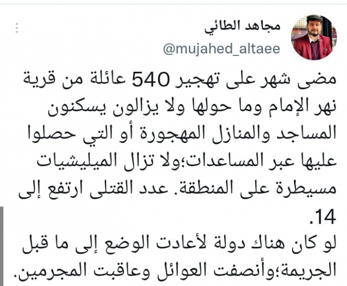 وشدد في تغريدة على حسابه بموقع التدوين المصغر تويتر، اليوم على: "مضى شهر على تهجير 540 عائلة من قرية نهر الإمام وما حولها".