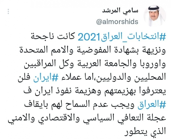 أكد المحلل السياسي السعودي سامي المرشد أن الأحزاب العراقية الموالية لنظام الملالي بطهران، ترفض الاعتراف بهزيمتها في الانتخابات النيابية لإيقاف مسار تطور الاقتصاد.