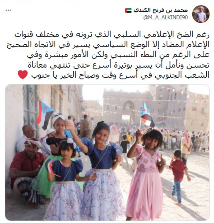 وأشار إلى أنه: "على الرغم من البطء النسبي لكن الأمور مبشرة وفي تحسن ونأمل أن يسير بوتيرة أسرع حتى تنتهي معاناة الشعب الجنوبي في أسرع وقت وصباح الخير يا جنوب".