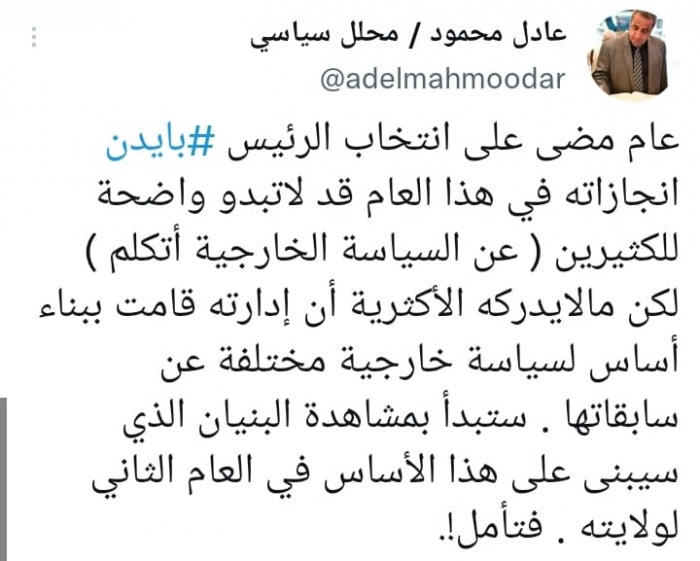 عادل محمود: سياسة بايدن الخارجية بلا إنجازات واضحة