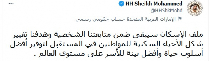 أعلن الشيخ محمد بن راشد آل مكتوم، نائب رئيس دولة الإمارات، رئيس مجلس الوزراء، حاكم دبي، أن ملف الإسكان سيكون تحت متابعته الشخصية، بهدف توفير أفضل بيئة للأسر.