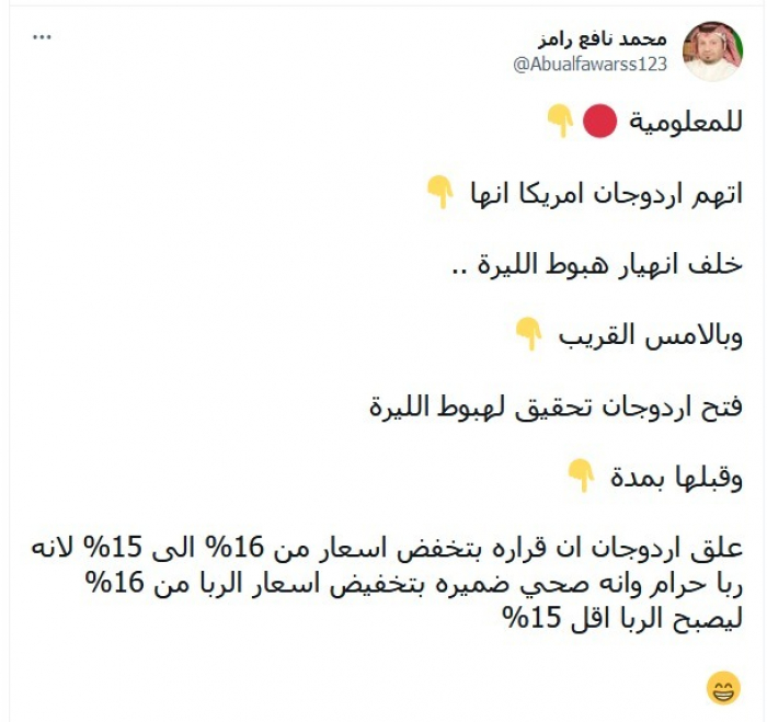 وواصل: "قبلها بمدة علق أردوغان أن قراره بتخفض أسعار من 16% إلى 15% لأنه ربا حرام، وأنه صحى ضميره بتخفيض أسعار الربا من 16% ليصبح الربا أقل 15%".