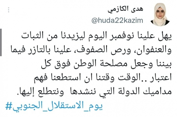 وأوضحت أنه: "علينا بالتآزر فيما بيننا وجعل مصلحة الوطن فوق كل اعتبار، الوقت وقتنا ان استطعنا فهم مداميك الدولة التي ننشدها ونتطلع إليها."، متابعة: "يوم الاستقلال الجنوبي".
