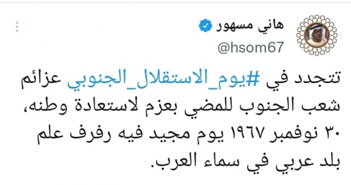 واعتبر في تغريدة على حسابه بموقع التدوين المصغر تويتر اليوم أنه: "تتجدد في يوم الاستقلال الجنوبي عزائم شعب الجنوب للمضي بعزم لاستعادة وطنه".