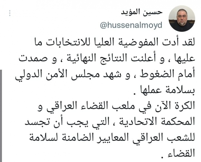 وأوضح أن: "الكرة الآن في ملعب القضاء العراقي والمحكمة الاتحادية، التي يجب أن تجسد للشعب العراقي المعايير الضامنة لسلامة القضاء".