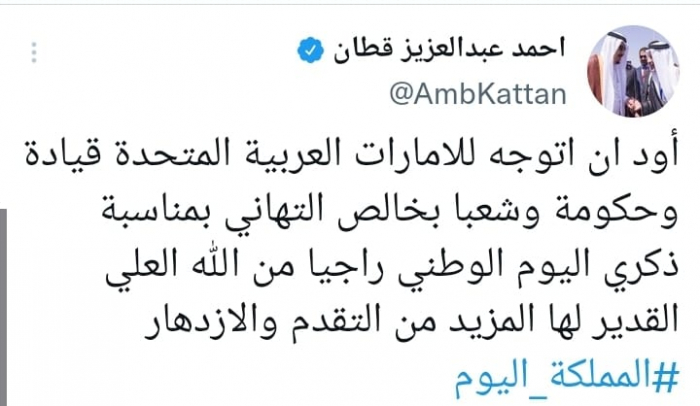 وأشار في تغريدة على حسابه بموقع التدوين المصغر تويتر، اليوم إلى أني: "أود أن أتوجه للإمارات العربية المتحدة قيادة وحكومة وشعبا بخالص التهاني بمناسبة ذكري اليوم الوطني راجيا من الله العلي القدير لها المزيد من التقدم والازدهار"، مختتما بهاشتاج: "المملكة اليوم".