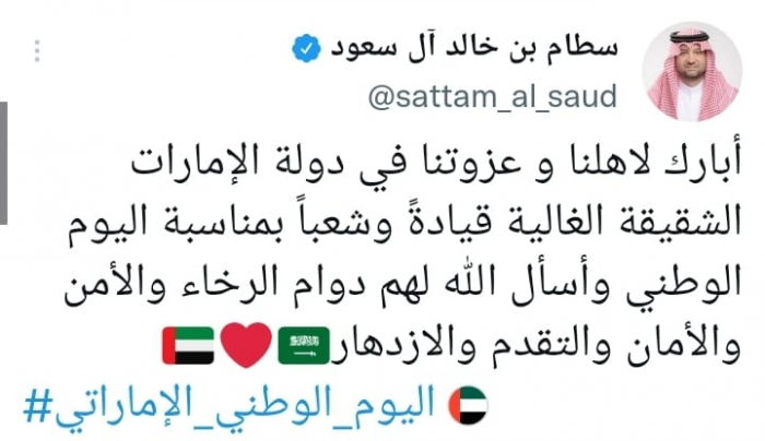توجه الأمير السعودي سطام بن خالد آل سعود، بالتهنئة إلى دولة الإمارات العربية المتحدة، بمناسبة يومها الوطني، واصفا قيادتها وشعبها بالعزوة.
