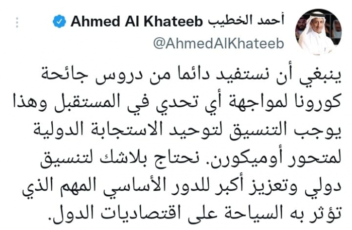 وأوضح في تغريدة على حسابه بموقع التدوين المصغر تويتر، اليوم أنه: "ينبغي أن نستفيد دائما من دروس جائحة كورونا لمواجهة أي تحدي في المستقبل، وهذا يوجب التنسيق لتوحيد الاستجابة الدولية لمتحور أوميكورن".