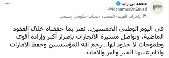 وكتب في تغريدة عبر "تويتر": "في اليوم الوطني الخمسين.. نعتز بما حققناه خلال العقود الماضية، ونواصل مسيرة الإنجازات بإصرار أكبر وإرادة أقوى وطموحات لا حدود لها.. رحم الله المؤسسين وحفظ الإمارات وأدام عليها الخير والعز والأمان".